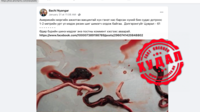Bachi Nyangar гэх фэйсбүүк хэрэглэгч 2021.01.31-нд “Америкийн моргийн ажилтан вакцинтай хүн гэнэт нас барсан хүний бие судас дотроос 1-2 метрийн урт үл мэдэх резин шиг шимэгч олдож байгаа” гэсэн пост оруулаад гурван зураг хавсаргажээ. Уг постыг 157 хүн шэйрэлж, 199 хүн лайк дарсан байна. Энэхүү постыг нягталж өгөх хүсэлт уншигчаас ирсний дагуу нягталлаа. Factcheck: Юуны […]