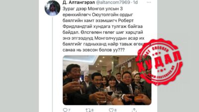 Д Алтангэрэл хэмээх твиттер хаягаас нэгэн зураг нийтэлжээ. Тайлбар нь “Зураг дээр Монгол Улсын гурван Ерөнхийлөгч Оюутолгойн ордыг баялгийн хамт эзэмшигч Роберт Фридландтай хундага тулгаж байгаа байдал. Өлсгөлөн гөлөг шиг харцтай энэ этгээдүүд Монголчуудын асар их баялгийг гадныханд найр тавьж өгөхдөө санаа нь зовсон болов уу” гэжээ. Энэхүү мэдээллийг нягталж өгөх хүсэлт ирсний дагуу бид […]