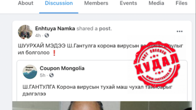 Тухайлбал, Sanjaajamts Chimgee гэх фэйсбүүк хэрэглэгч 2021.01.25-нд “ХУУРАМЧ ТАХАЛ ГЕНОЦИТ НЬ ИЛЧЛЭГДЭЖ ДЭЛХИЙН УЛС ОРНУУД ВАКЦИНАА ЗОГСООЖ БХАД МОНГОЛЧУУД МУТАЦЫН ҮЛГЭРТ НЬ ИТГЭЖ ХОРОО ШАХУУЛЖ БДАГ АРАГГҮЙ МУНХАГ АЙМХАЙ ХУВИА ХИЧЭЭГЧ АРД ТҮМЭН ЮМАА” гэсэн пост оруулсныг 110 хүн шэйрэлжээ.
