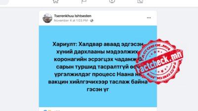 Тухайлбал, Sanjaajamts Chimgee гэх фэйсбүүк хэрэглэгч 2021.01.25-нд “ХУУРАМЧ ТАХАЛ ГЕНОЦИТ НЬ ИЛЧЛЭГДЭЖ ДЭЛХИЙН УЛС ОРНУУД ВАКЦИНАА ЗОГСООЖ БХАД МОНГОЛЧУУД МУТАЦЫН ҮЛГЭРТ НЬ ИТГЭЖ ХОРОО ШАХУУЛЖ БДАГ АРАГГҮЙ МУНХАГ АЙМХАЙ ХУВИА ХИЧЭЭГЧ АРД ТҮМЭН ЮМАА” гэсэн пост оруулсныг 110 хүн шэйрэлжээ.