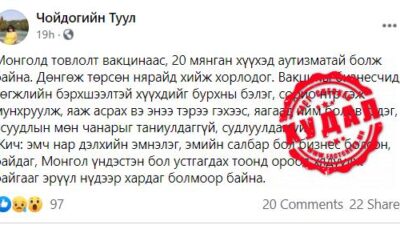 Чойдогийн Туул нэртэй фэйсбүүк хэрэглэгч “Монголд товлолт вакцинаас, 20 мянган хүүхэд аутизматай болж байна. Дөнгөж төрсөн нярайд хийж хорлодог. Вакцины бизнесчид, хөгжлийн бэрхшээлтэй хүүхдиг бурхны бэлэг, сорио нтр гэж мунхруулж, яаж асрах вэ энээ тэрээ гэхээс яагаад ийм болов гэдэг, асуудлын мөн чанарыг таниулдаггүй, судлуулдаггүй. Жич: эмч нар дэлхийн эмнэлэг, эмийн салбар бол бизнес болсон, […]