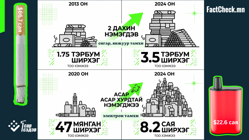 Сигар болон янжуур тамхины импорт 2013 онтой харьцуулахад 2024 онд хоёр дахин нэмэгдэж, 3.5 тэрбум ширхэгт хүрсэн байна. Харин электрон тамхи 2020 онд ердөө 47 мянган ширхэг импортлогдож байсан бол 2024 онд 8.2 сая ширхэг болтлоо асар хурдтай нэмэгджээ. Ийнхүү Монгол Улсын тамхины нийт импорт 90 гаруй сая ам.долларт эргэлдэж байгаа ба монголчууд шинэ төрлийн тамхин бүтээгдэхүүнийг ямар ихээр сонирхон хэрэглэж байгааг илтгэж буй юм.